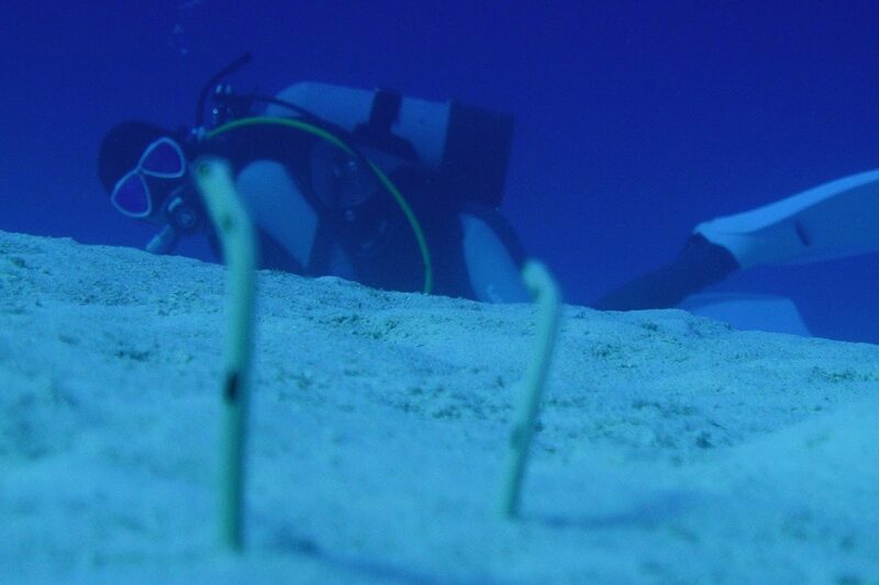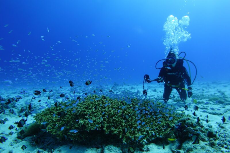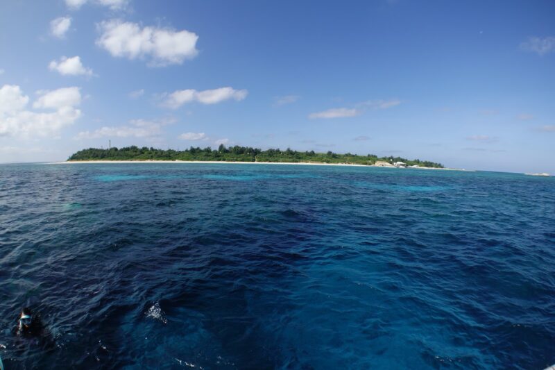 2本目:水納島(灯台下浅場) 風速:北西6m 波:0.5m うねり: 透明度25m 水温:28℃ 流れ:下げ1