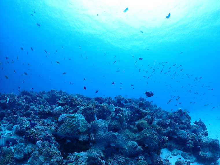 1本目:水納島(灯台下 浅場) 風速:東北東5m 波:0.3m うねり:あり 透明度20m 水温:28℃ IN:9:10 OUT:9:50 TIME:40分 MAX:16m 平均:11m