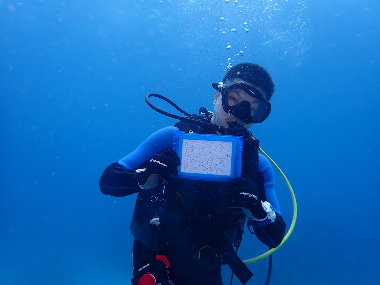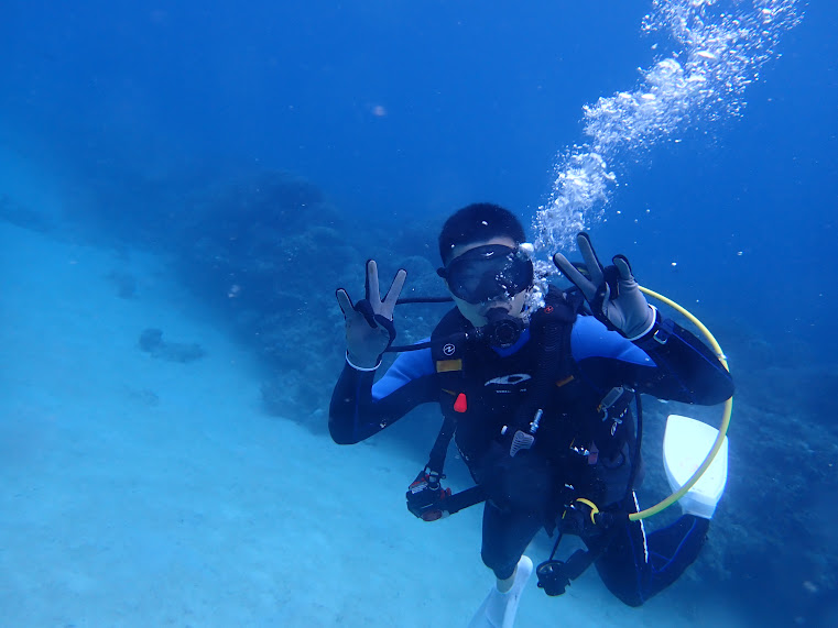 今日は先日AOW講習でご来店して頂いたたいしょうが続きの2本を開催する為に来て頂きました!前回の中性浮力の勉強の甲斐があってものすごく水中も安定して泳ぐ事でき、水中生物に配慮、安全管理をしながらカメラをして、ボートダイビングでの名称や使用方法も学んで無事にAOW合格となりました!