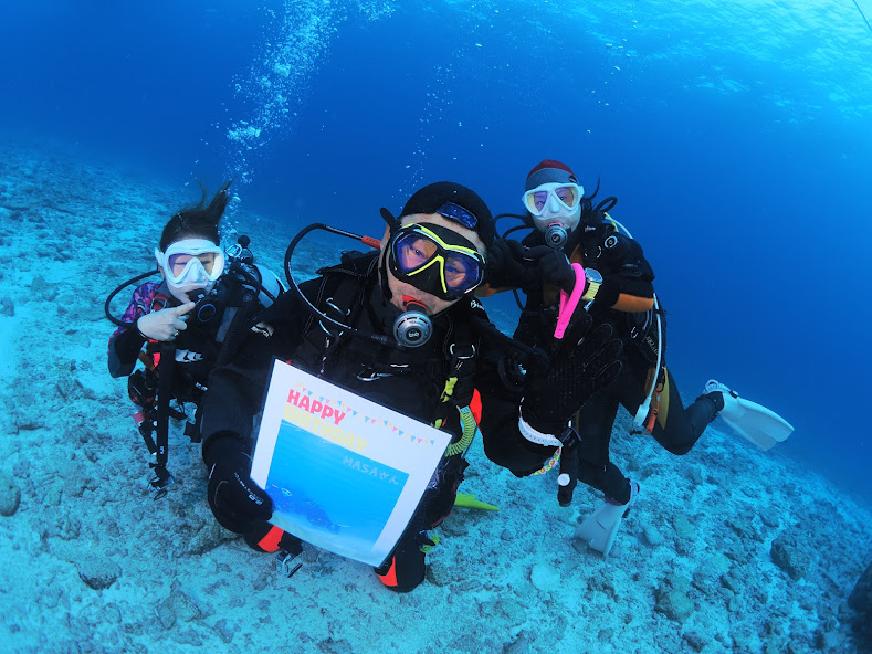 今日の午前はマサさんの誕生日ダイビング♪マチコさんとみーちゃん!!みんなでお祝いダイビング!!午後からはイケちゃんも参戦♪なんだかんだやっと本部らしいのんびりダイビングが出来た一日でした!!マサさん!!お誕生日おめでとうございます(^^♪