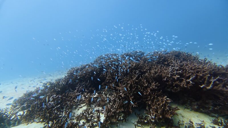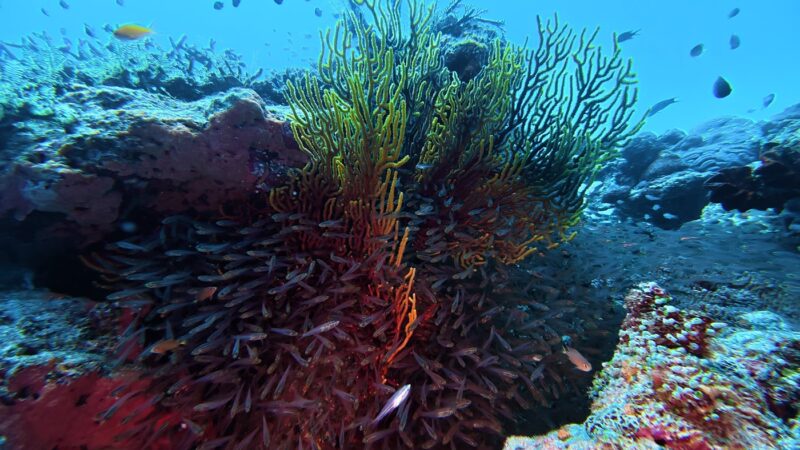 大きめサイズのデバスズメダイがたくさん群れていて、こちらもめちゃくちゃ綺麗でした!