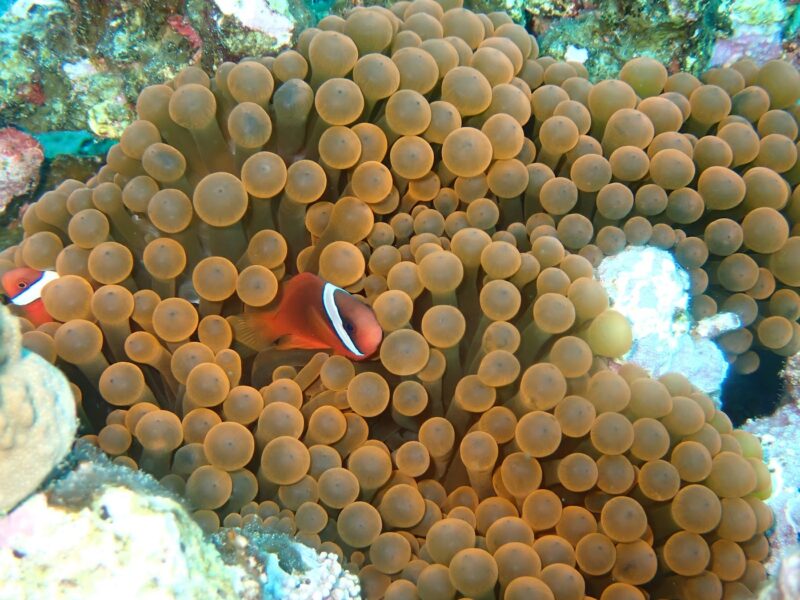 途中にいたハマクマノミ、通常はライン1本ですが、2本ラインの子がいて