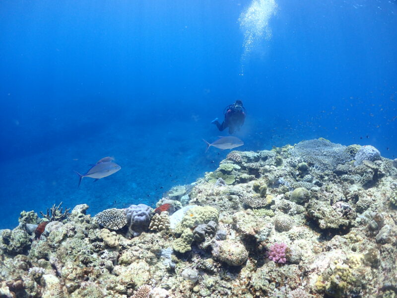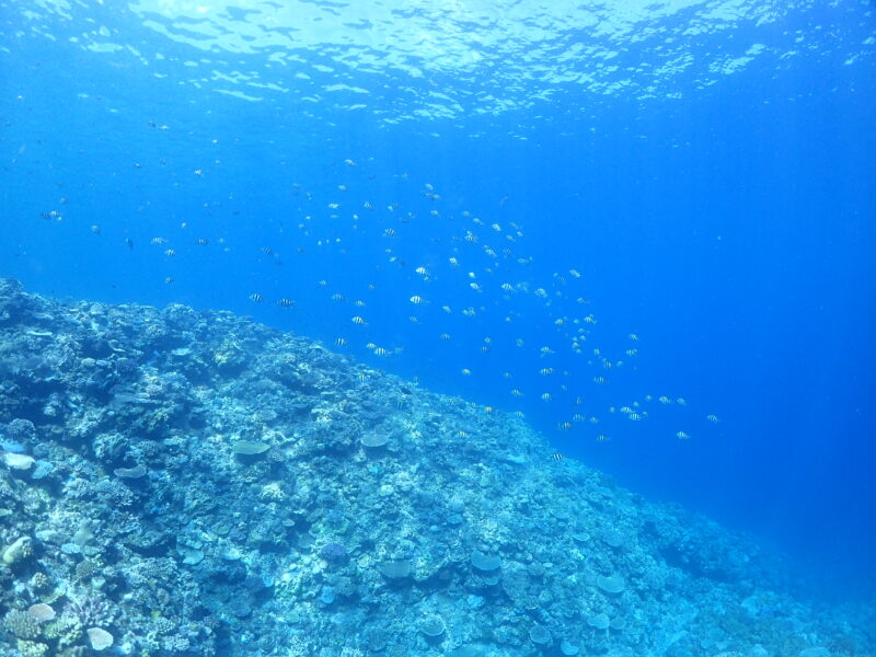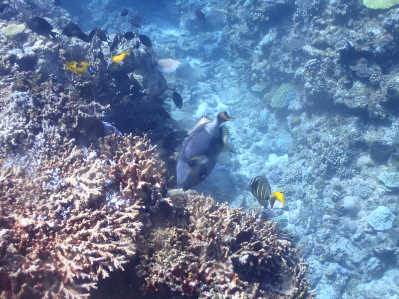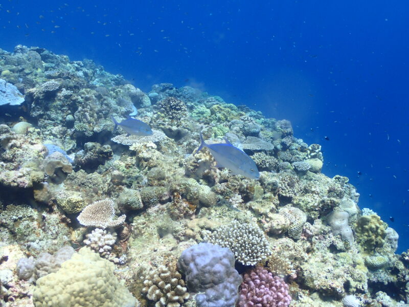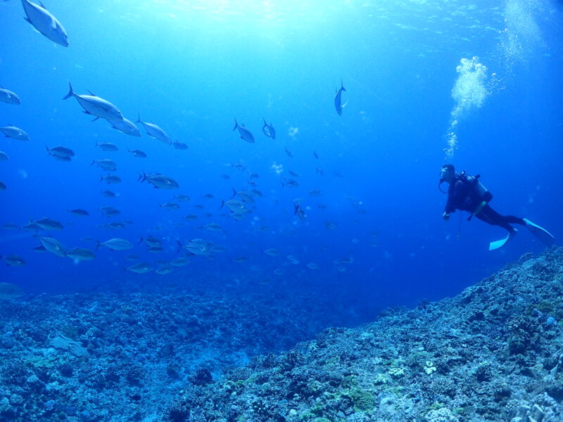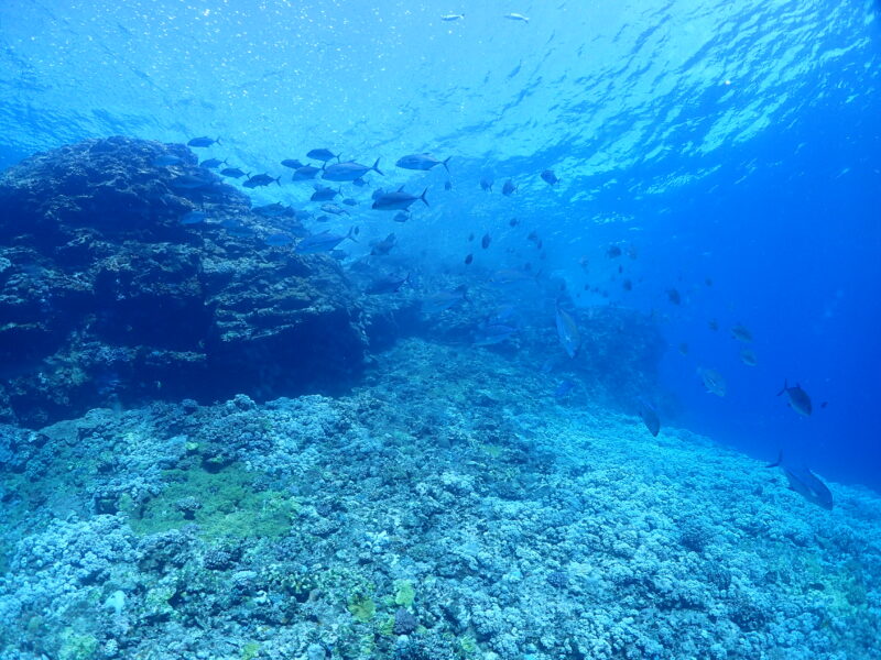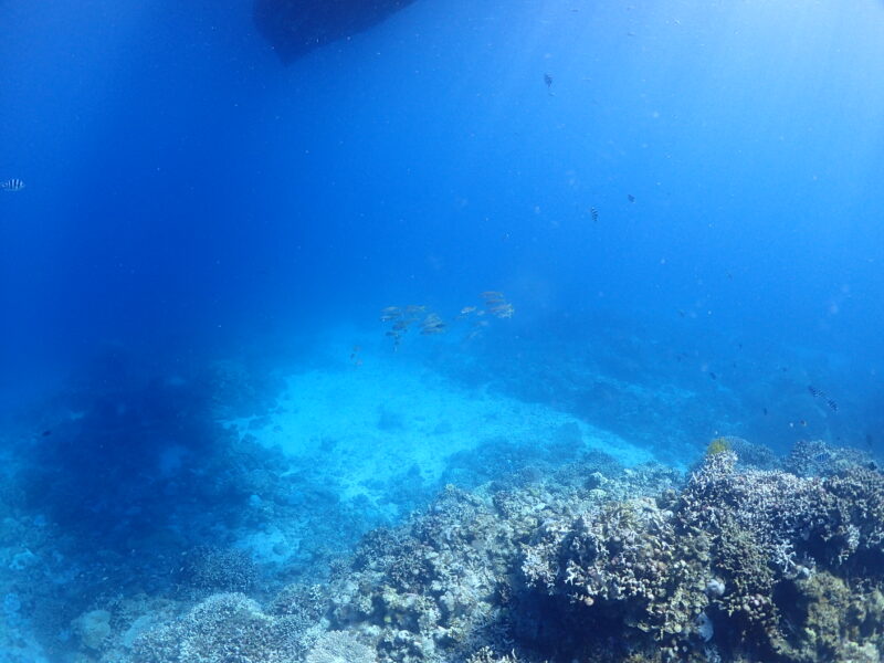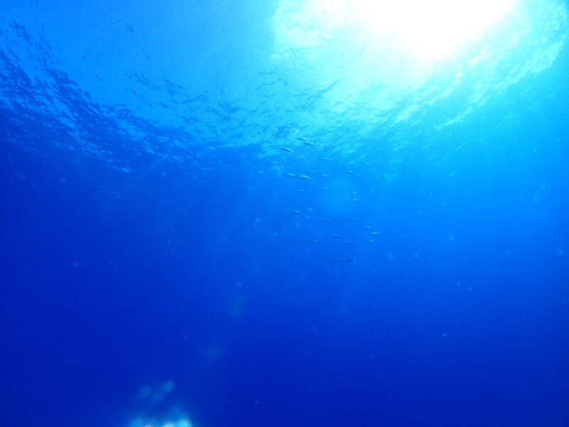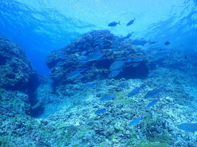 そして・・・!!!遠くからアジの群れが😲(最初ギンガメアジかと思いましたが・・・)