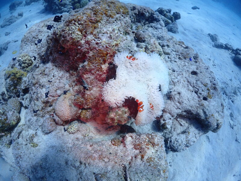 白化した真っ白なイソギンチャクにカクレクマノミが映えます😊