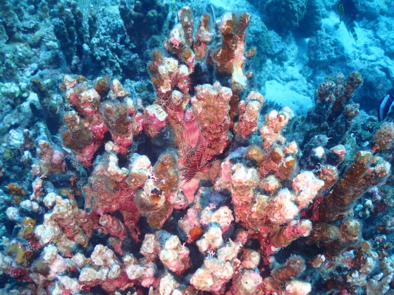 サンゴのすき間に、ネッタイミノカサゴの幼魚が!