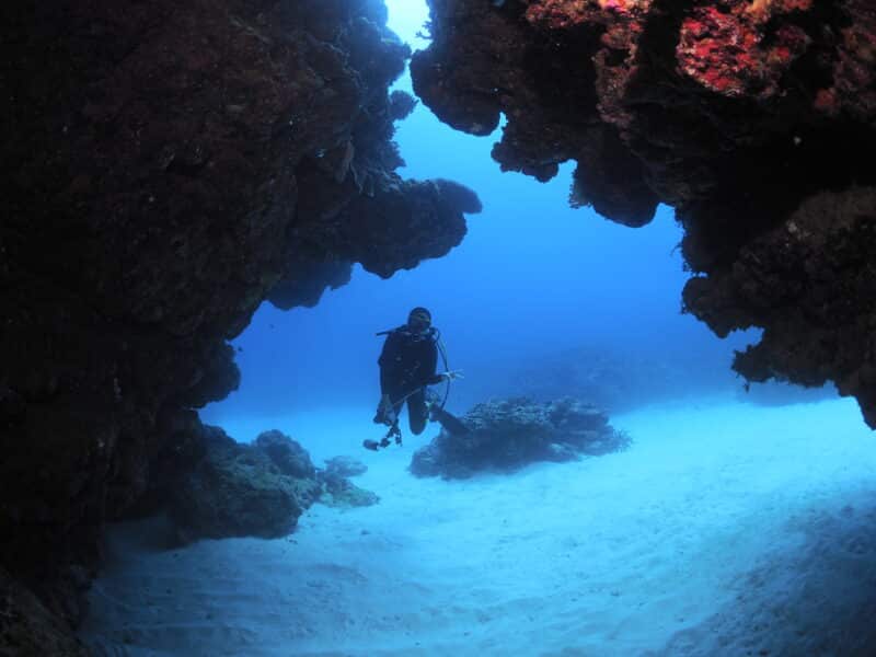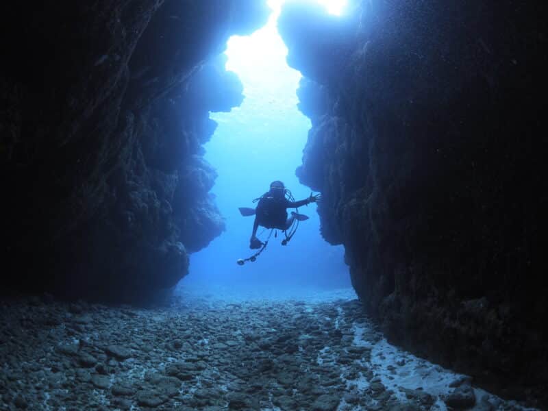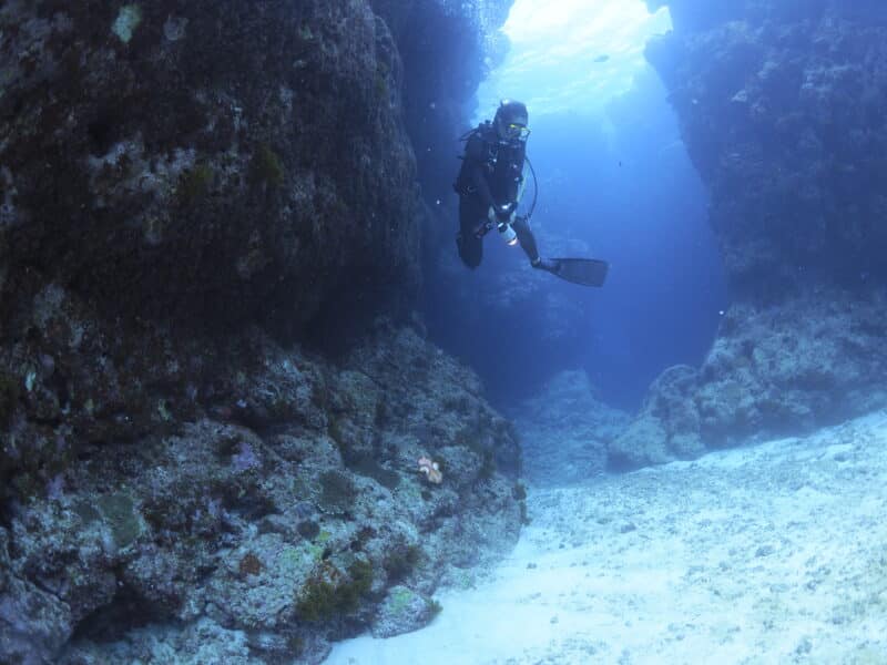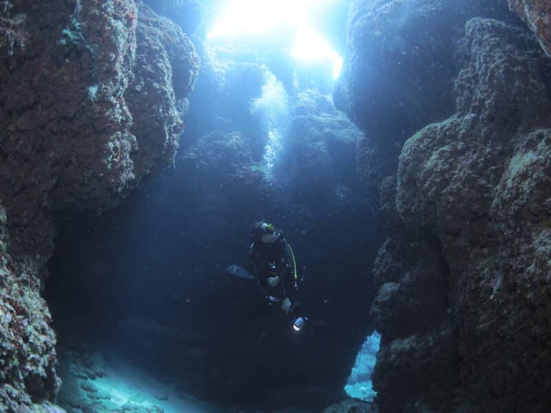 1本目:渡嘉敷島(クレバス)水温:22℃ 流れ:なし IN:10:20 OUT:11:01 TIME:41分 MAX:14m 平均:10m 透明度20m