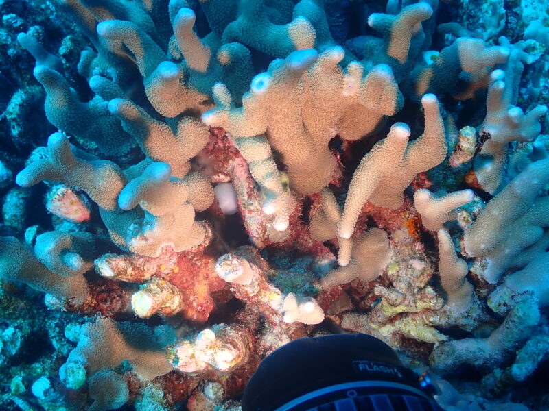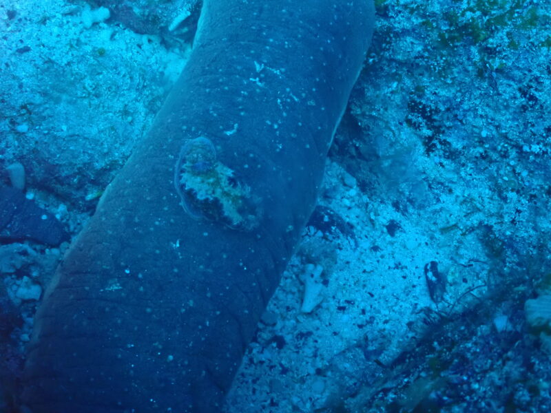 ナマコにモンジャウミウシがくっついていました。光が吸収されてこんな色に・・・