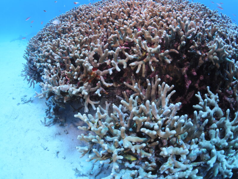 ユビエダハマサンゴのすき間に隠れてた「ハナミノカサゴ」